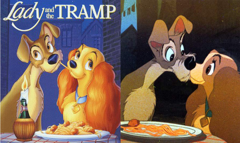 Lady and Tramp were both eating the end of a noodle at the same time, their